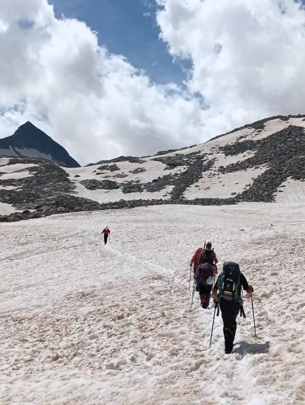 Prendiamo gli impianti del Presena che ci portano fino all’omonimo passo a quota 2997. Da qui iniziamo la discesa verso il Rifugio Mandrone (quota 2442). Risaliamo poi lungo il sentiero e quindi il ghiacciaio Pian di Neve fino al Rifugio Caduti dell’Adamello (quota 3040, circa 3 ore dal Mandrone), dove faremo cena e pernottamento.