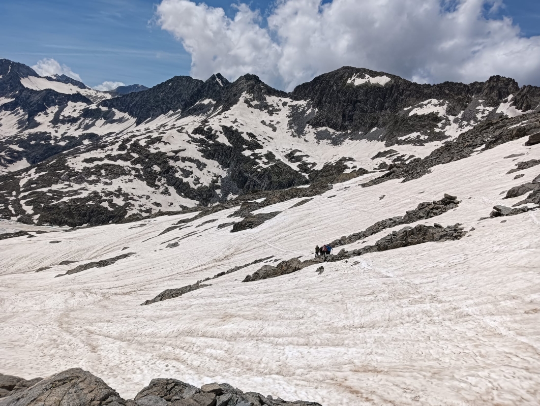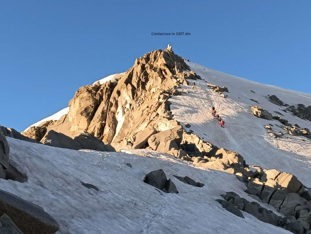 Partiamo di buonora dal Rifugio Caduti dell'Adamello per salire in circa 1,5 ore a Cime Crestacroce (3307). Continuiamo poi lungo la cresta fino ad arrivare, dopo circa un'ora, alla postazione del cannone, portato lassù dai soldati italiani nel 1916. Si scende da un ripidissimo canalone fino ad arrivare al Pian di Neve, quindi rientro al Mandrone e risalita a Passo Presena.